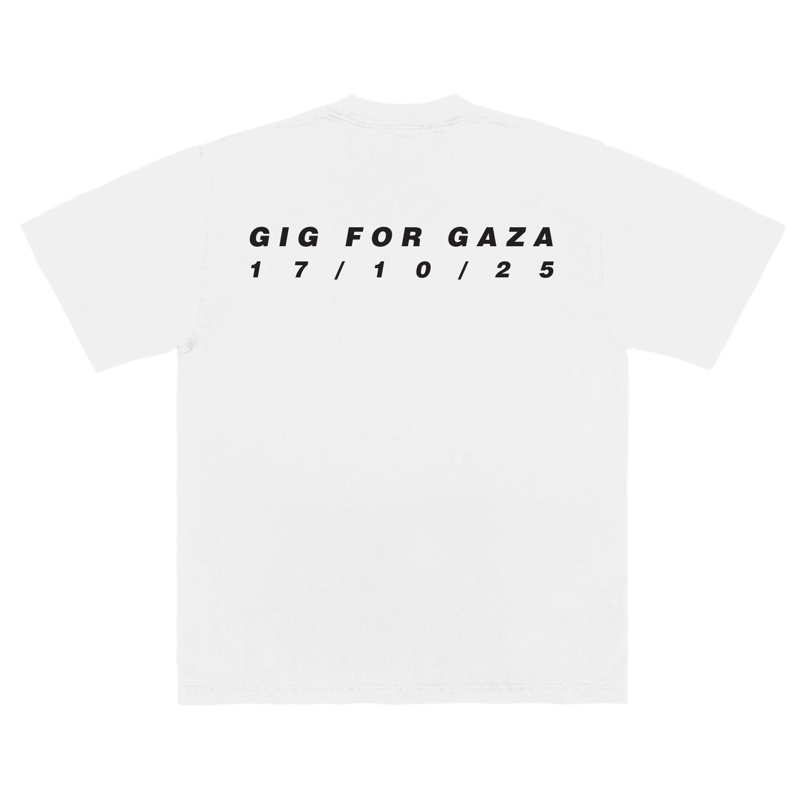 100% organic cotton unisex white t-shirt. Featuring Gig for Gaza artwork on the front and event date on the back.